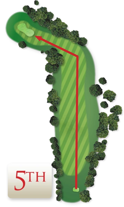 A left hand dogleg Par 4 with Out of Bounds to the left. A good long drive will give you a clear shot to the green, otherwise you'll need a lofted club to get over the trees on the corner.